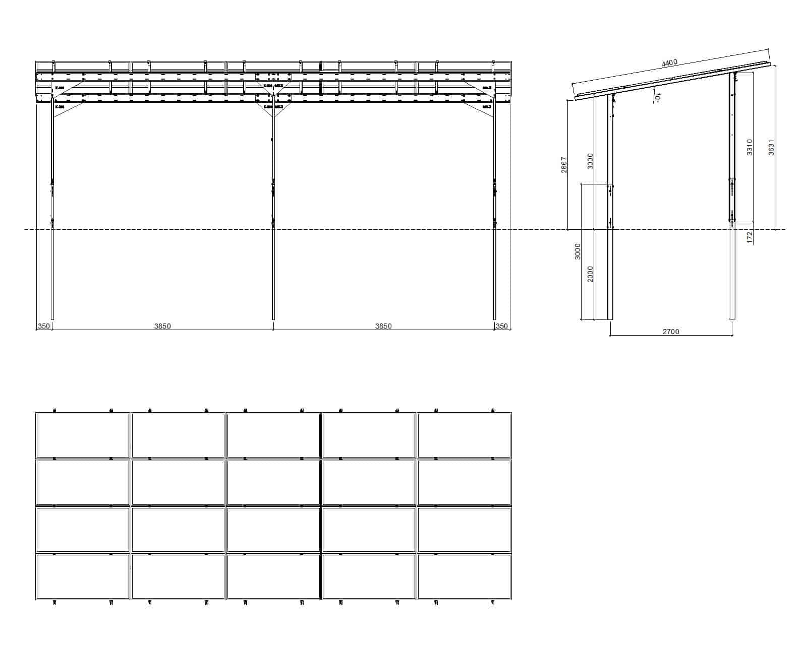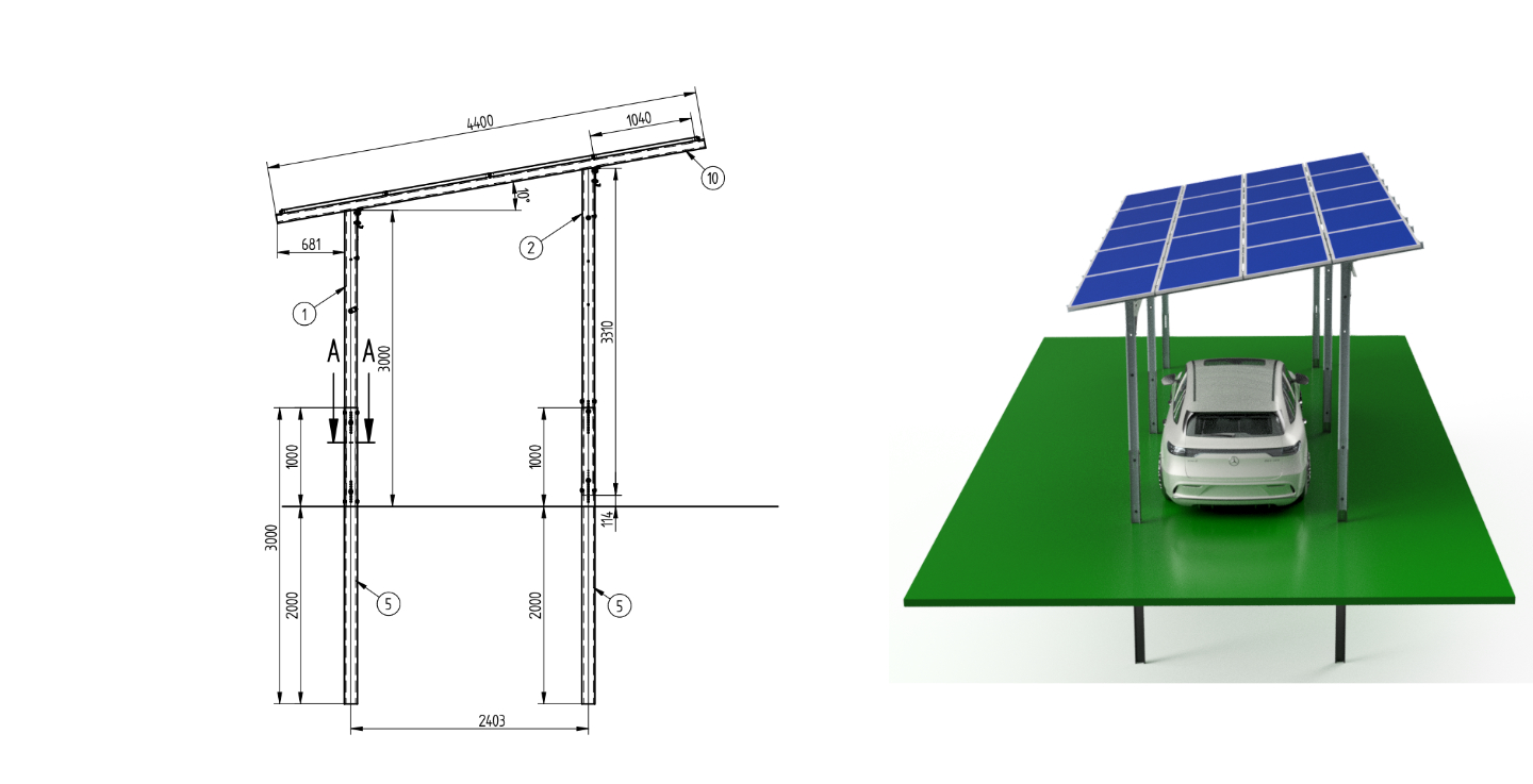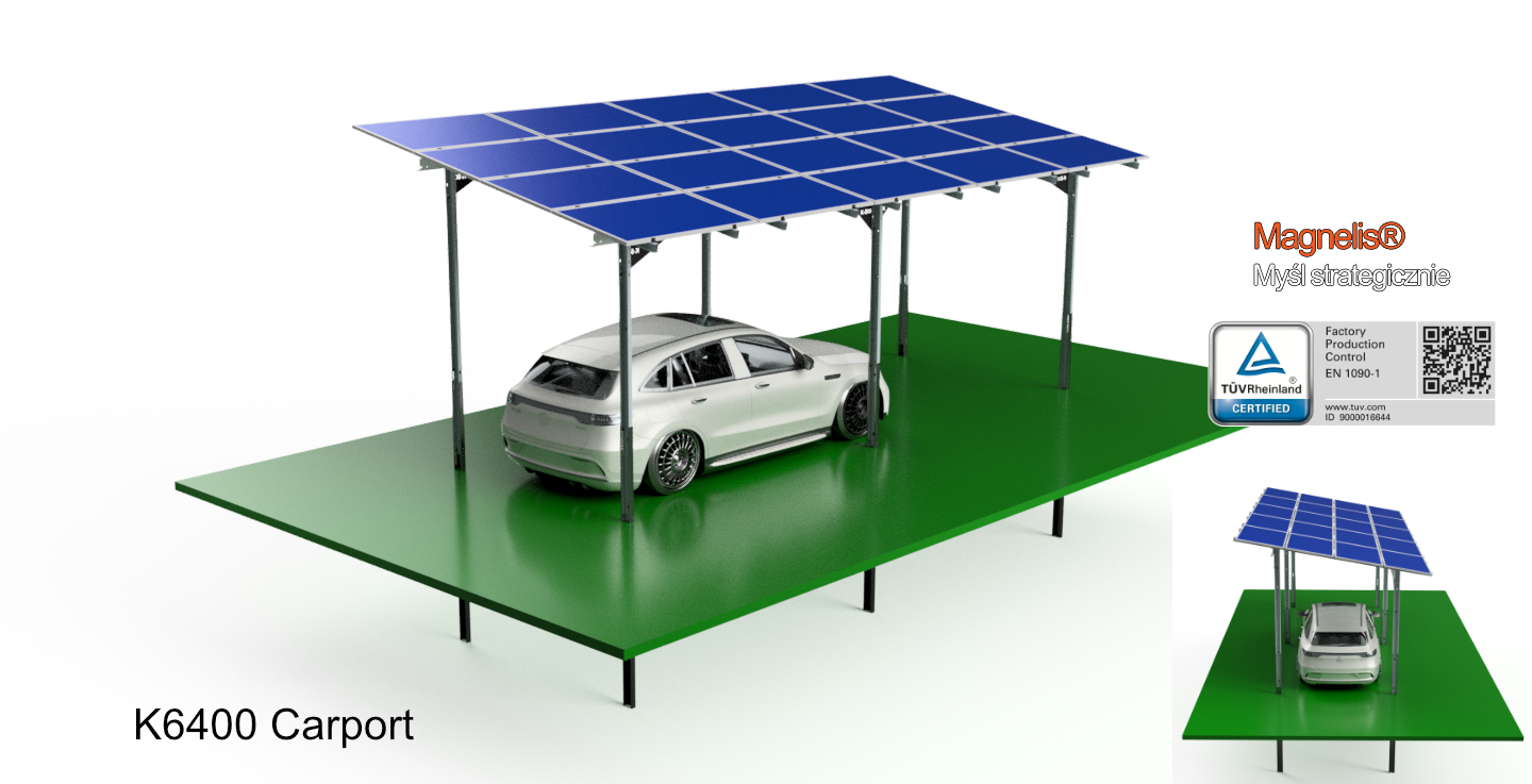 Wiata zaprojektowana zarówno dla przemysłu jak i firm, do wykorzystania w przydomowych warunkach jak i w wielkopowierzchniowych parkingach pokrytych kostką brukową lub wylanych powierzchniach asfaltowych. Instalacja Carportu jest banalnie prosta i nie niszczy istniejącej infrastruktury. Kolejną zaletą jest możliwość rozbudowy konstrukcji o dowolną ilość modułów. Funkcjonalność, trwałość, wytrzymałość czy prostota montażu to tylko niektóre zalety naszego Carportu. Wysokość konstrukcji sięgająca nawet 3,39 m (w najniższym jej punkcie) oraz rozstaw podpór równy 5,25 m pozwalają na swobodne postawienie dużych busów lub maszyn rolniczych.